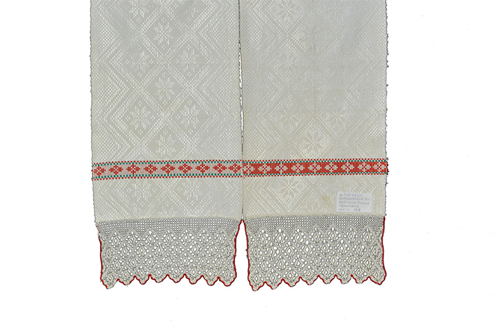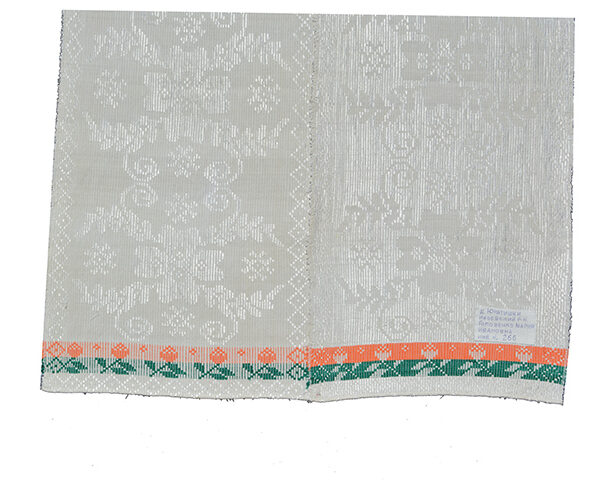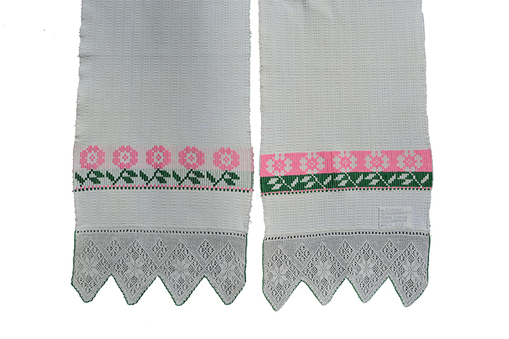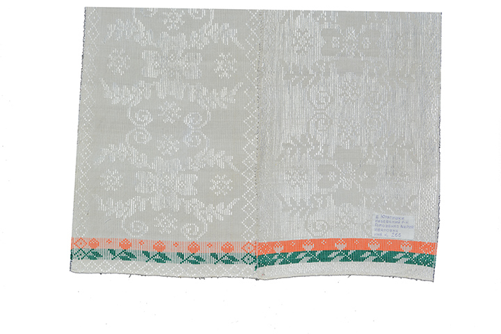 Характэрная адметнасць такіх вырабаў – белы колер тканіны з дробным структурным узорам, утвораным своеасаблівым перапляценнем нітак асновы і ўтку.
